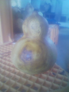 ・ひょうたんの口は大ひょうたんで12㎜のドリルが種も取りやすく良かった。 ・種を取り出すとき、ひょうたんに水を入れると軽い種は口の方にくる。 ・軽い種を取り出した後ひょうたんをひっくり返すと今度は重い種(水に沈む種)が口にくる。そこから栓をしていた指を離すと水と一緒に種が出る。また取りにくい種はピンセットで取り出す方法も良い ・陰干し後の皮取りは水に浸けると表面の皮(表皮)が柔らかく良い ・どうしても取りにくい皮は真鍮製のブラシが良い ・ひょうたんを形作った皮(真皮)は乾きが早いとシワになる。乾き加減を見て調整する。 ひょうたんが乾き、皮(真皮)が形成されると太陽光にさらしても大丈夫である 水に浸けたひょうたん(中身を腐らせる方法)は早い目(通常2週間~1ヵ月間)に出した方が良かった(10~12日間) |