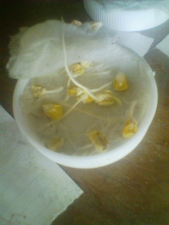 実験用トウモロコシの芽が出た。区分けしたなかで、水に浮いた種が半分くらい、水に沈んだ種がほとんど、実の端(茎側)一つ真ん中一つ、端(穂先)無しとなった。まだ答えを出すのは、早いかもしれないが、栄養は茎側から順に貯まっていくようだ。