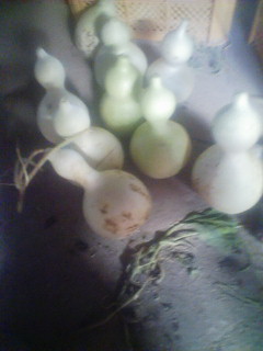 田んぼの都合上ひょうたんを全部収穫した。まだ青いものがあったが、かまわず取り入れた。家で小さな品評会をやっている。大きなひょうたんは水に浸けて小さなひょうたんは陰干しする。去年のひょうたんが加工できずまだ残っているので、どこか売れないか、思案中だ。