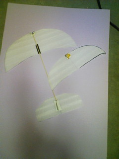 1.材料は竹ヒゴ(11本150円くらい)、ワレモノシート(20枚入り200円くらい) 2.シートの真ん中に線を引く。3.シートを半分に折り飛行機の翼の形に切る(開いた時左右対称)。 4.竹ヒゴを翼の真ん中に貼り付け翼の二つをつなぐ。 5.前にテープなど貼り付け重心を調整する。 投げる時は空中に置くような感じで。また、浮いた後戻ってくる場合重心が後ろにあります。翼は一つでもOKです。 上手く出来るとものづくりは楽しいです。子供とのコミュニケーションツールとしても良いですよ。 |